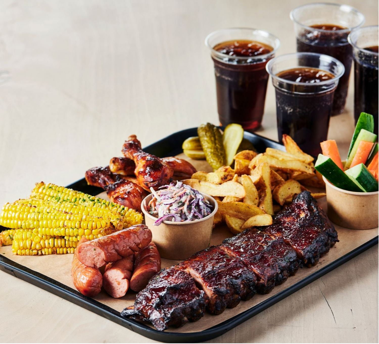 - Spareribs, crispy chicken, skovpølse, coleslaw, majsribber, cornichoner, årstidens gnavegrønt, kartoffelbåde.